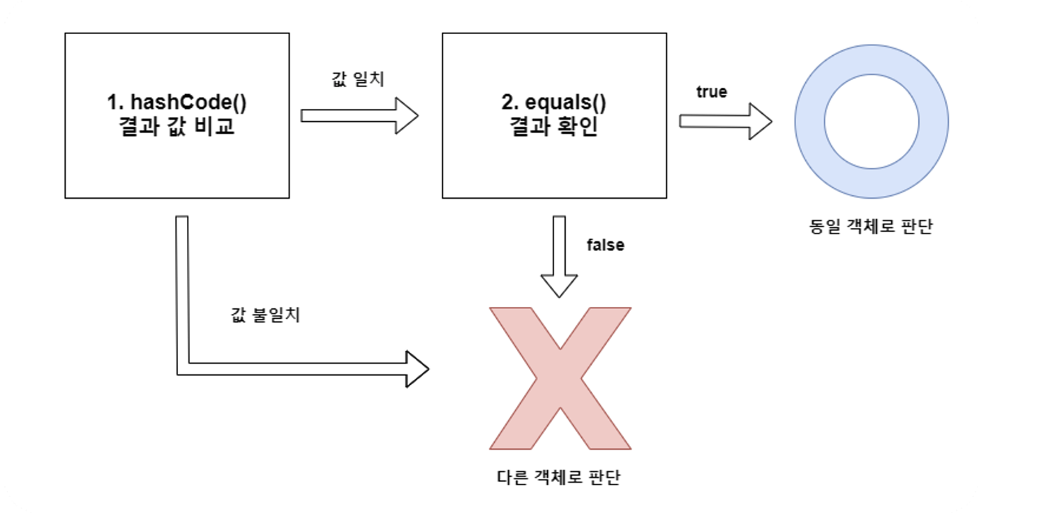 - 두 객체의 해시코드 값이 같으면 equals()를 통해 한번더 확인한다. . equals()는 두 객체의 주소값이 아닌 값을 확인하므로 이때 이 값이 다르면 당연히 다른객체, 값이 같으면 동일 객체로 판단한다.