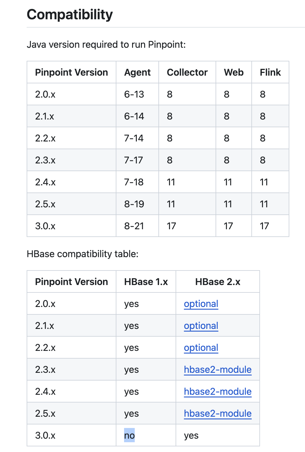 프로젝트가 JDK 17이기때문에 Pinpoint Agent는 3.0.x를 사용하려고 했으나 HBase 1.x와 호환이 안되기때문에 Pinponint를 2.5.1로 결정하고 JDK 11를 추가로 설치하기로 했다.
