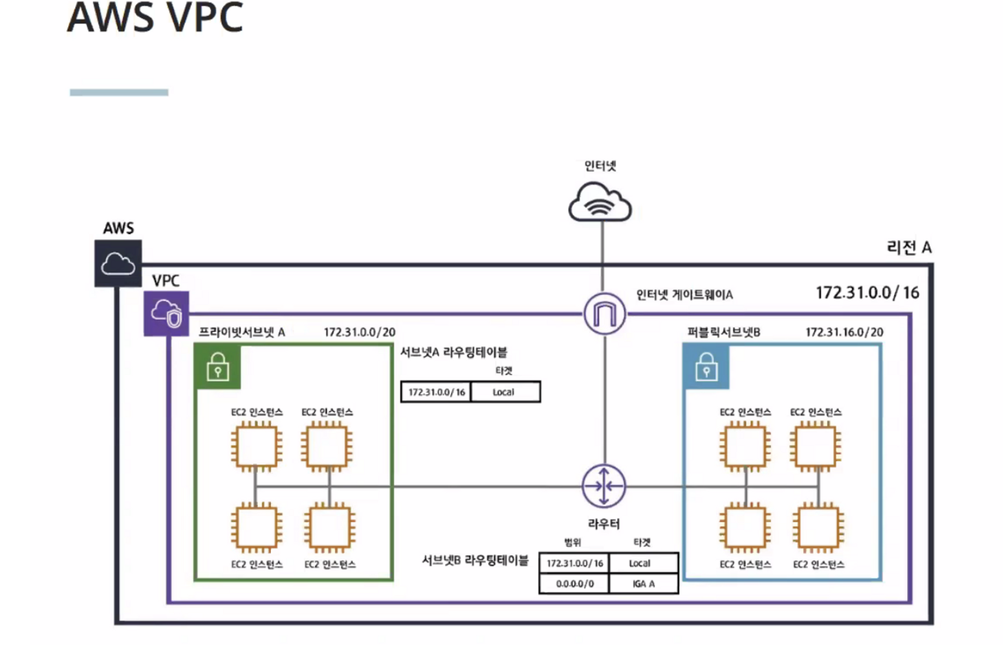 - VPC 안에 구성할 수 있는 서브넷 속성으로는 퍼블릿 서브넷과 프라이빗 서브넷이 있다. 서브넷은 VPC영역 안에서 망을 쪼개는 데 사용한다.
