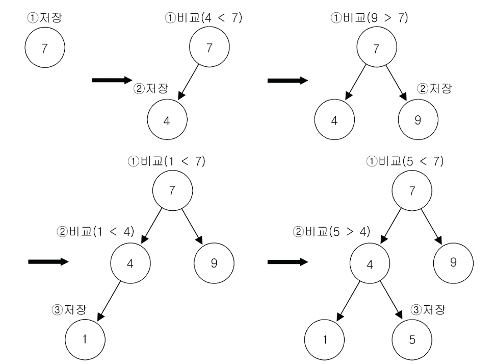 예를들어 이진 검색 트리에 7,4,9,1,5의 순서로 값을 저장한다고 가정하면 밑의 그림과 같은 저장과정을 거친다.