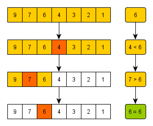 - 시작점 9, 끝점 1, 그리고 중간점으로 4로 정하고 찾아야하는 값 6과 중간점 4을 비교한다.