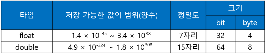 float 타입의 정밀도는 7자리, double타입의 정밀도는 15자리인데 따라서 메모리를 절약하려면 float, 높은 정밀도가 필요하면 double 타입을 사용해야한다.